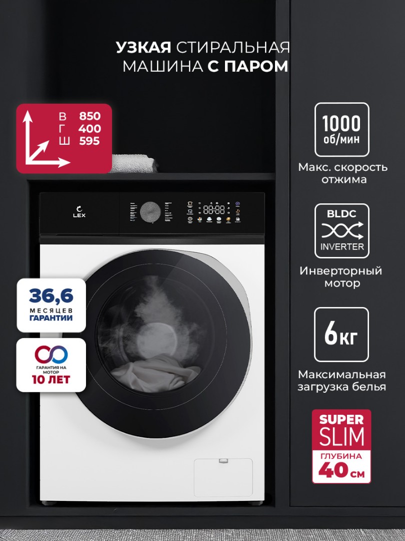 Стиральная машина LEX Slim — это качество на долгие годы, а увеличенная гарантия 36,6 месяцев — это лишнее тому подтверждение!