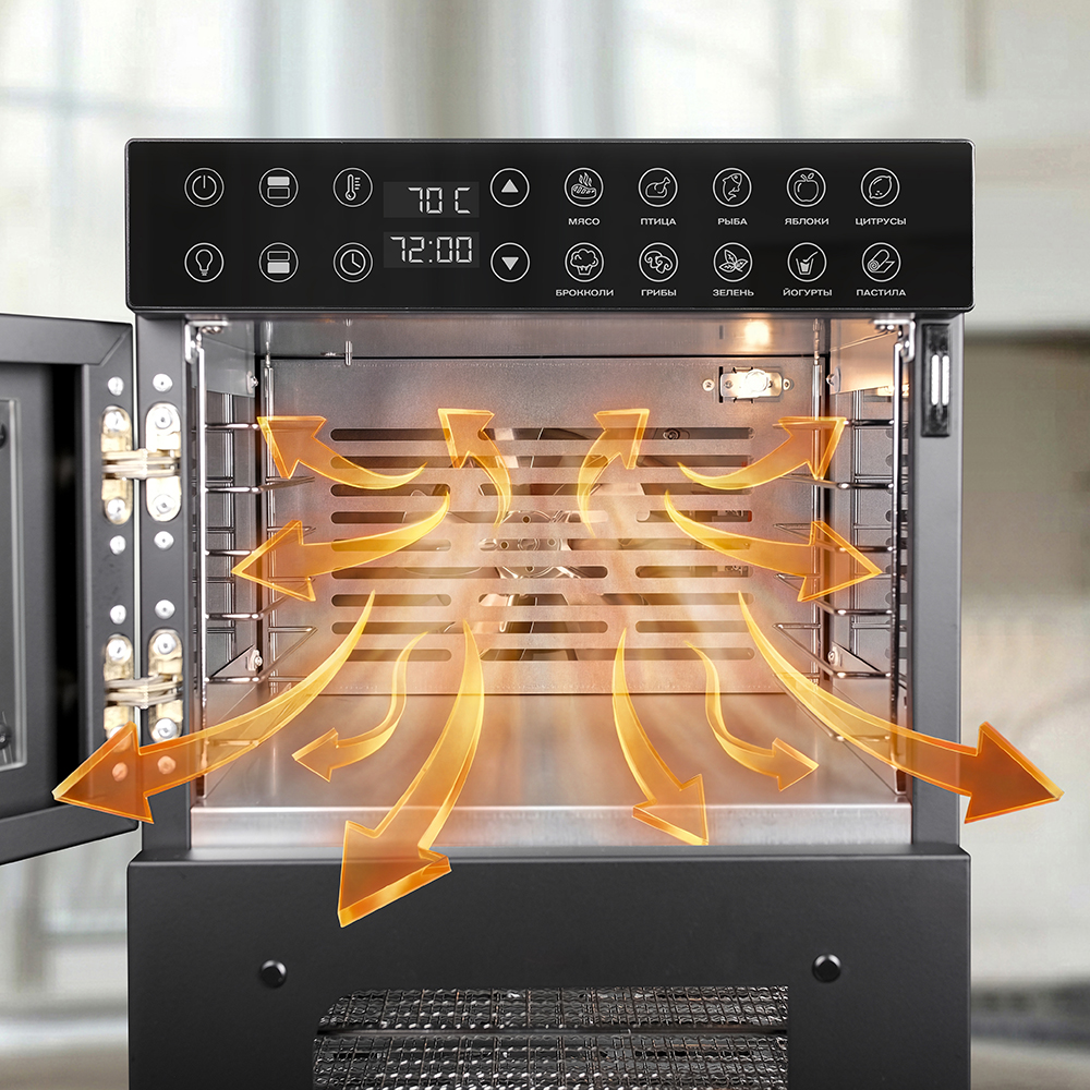 Такая циркуляция особенно важна при одновременной сушке разных ингредиентов: например, травы и фруктов. Они не смешивают ароматы и не теряют свой цвет. Кроме этого, не стоит волноваться о перегреве устройства — встроенная защита обезопасит и пользователя, и продукцию.