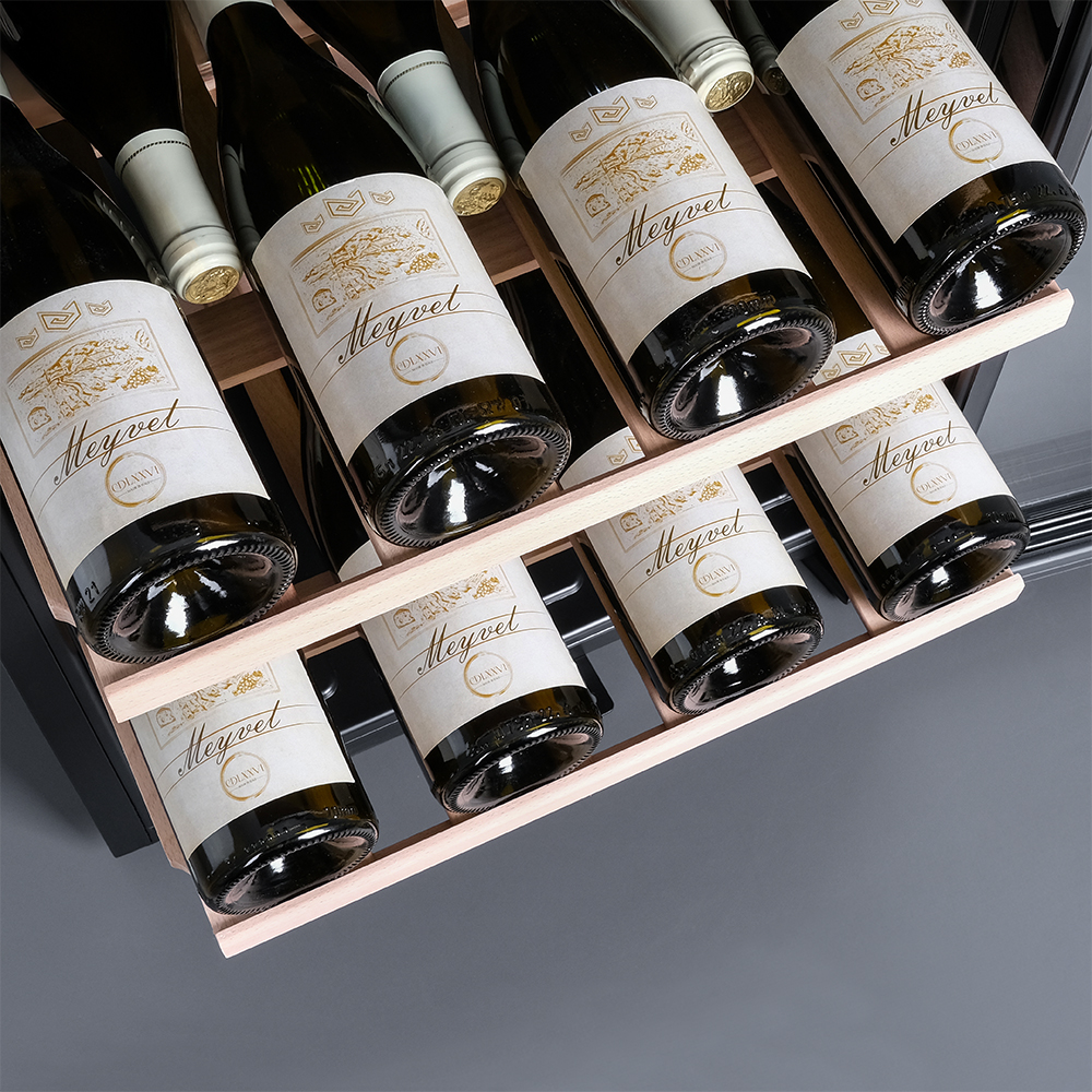 Модель оснащена четырьмя полками из дерева, что не только выглядит стильно, но и способствует правильной циркуляции воздуха внутри шкафа. Дополнительно можно установить до 6 полок, а также приобрести демонстрационную полку и полку для фужеров. Двойное стекло с УФ-фильтром надежно защищает вино от вредного воздействия света, что сохраняет его уникальный вкус и аромат.
