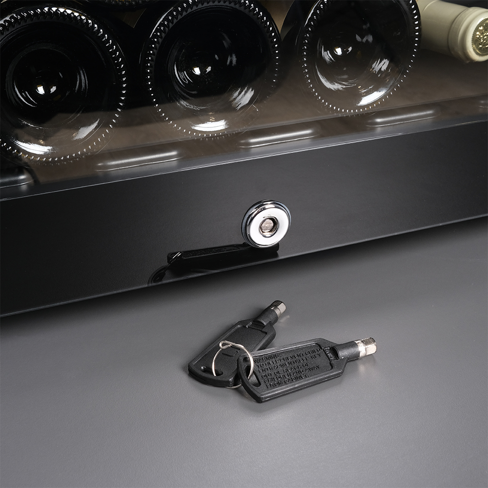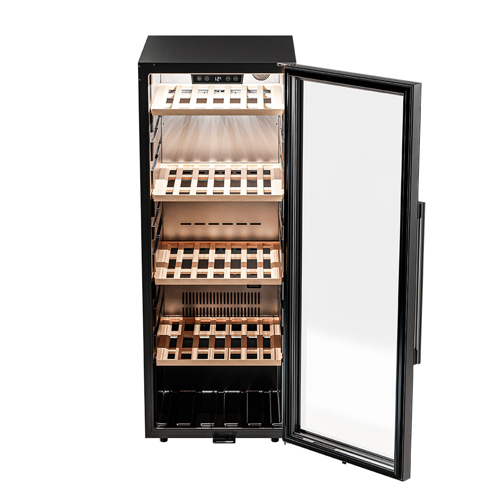 Управление осуществляется через сенсорную панель, а настройка интуитивно понятна. Также предусмотрены важные функции для защиты винотеки: замок на двери для безопасности, угольный фильтр, который очищает воздух внутри шкафа от посторонних запахов, сигнализация отклонения температуры, которая предупреждает о любых изменениях в условиях хранения, и блокировка панели управления, предотвращающая случайные изменения настроек.