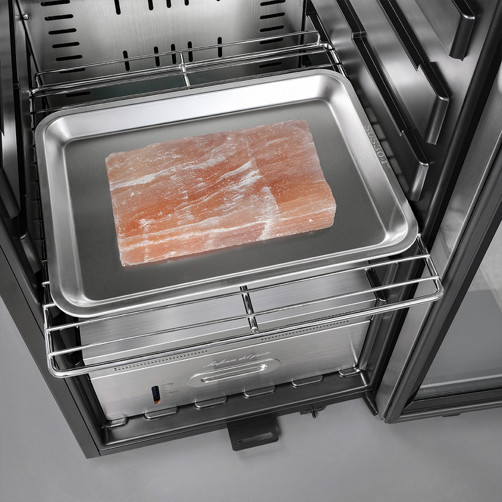 Внутреннее оснащение холодильника продумано до мелочей. Регулируемые ножки позволяют выровнять устройство, а встроенные крюки, поднос для соли и полки из нержавеющей стали облегчают размещение и сушку содержимого. Резервуар для воды дает возможность контролировать уровень влажности в диапазоне от 60 до 85%, что важно для равномерного вызревания.