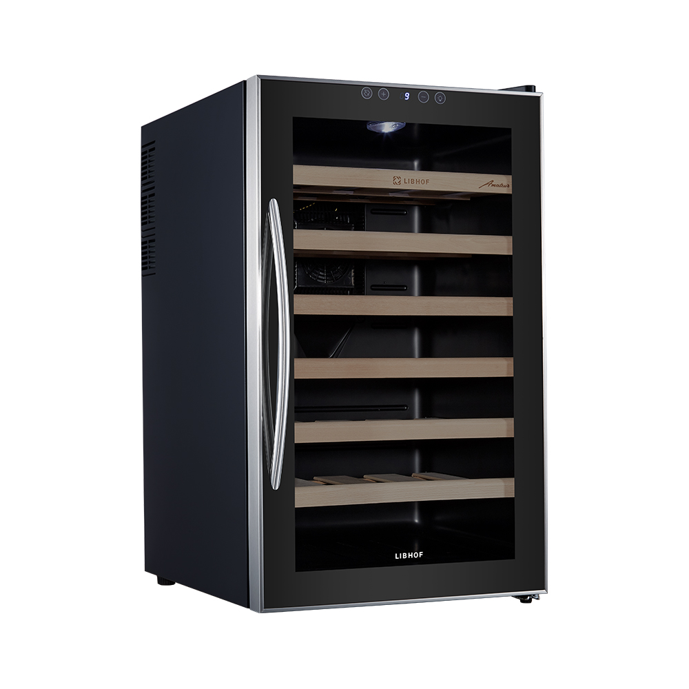 Монотемпературный шкаф Libhof AM-28 отвечает всем требованиям для идеального хранения вина. Термоэлектрическая система охлаждения гарантирует очень низкий уровень шума, равный всего 41 дБ, и практически полное отсутствие вибраций. Чтобы пробки не рассыхались, и в вино не попадал кислород, бутылки кладутся горизонтально на шесть съемных полок из массива бука.